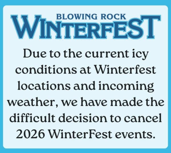 Provided by: Blowing Rock Chamber of Commerce Blowing Rock, NC – Due to the extreme icy conditions, the weekend forecast and the winter storm warning the Blowing Rock Chamber of Commerce has decided to cancel WinterFest 2026. The Cancelled events are: – Polar Plunge – Rotary Chili Challenge – Speckled Trout Beer Garden – Cocoa and Hayrides The Chamber made the decision based on a philosophy of “safety first” for participants and guests. The ice sculptures will be placed on Friday and available to stroll, view, and snap a few selfies! The Live Ice Sculpture Demo will take place from 12-4 on Saturday at Memorial Park. Ticket holders are being notified by the Chamber.