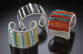 The handcrafted silver necklaces and earrings of Rebecca Hellman feature gemstones of turquoise, aquamarine, green amethyst and blue topaz accented with quartz and pearls. Her designs on exhibit showcase her creativity and originality with some of her necklaces displaying a kinetic element.