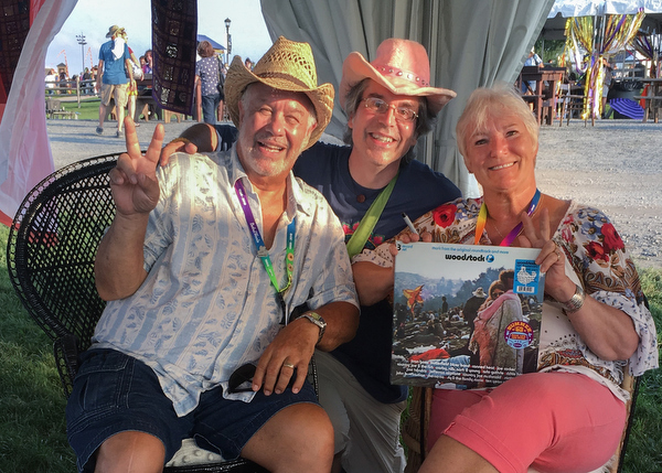 For those who are open to it, among these hills where monuments, markers, signs and images relate to Woodstock 69, an impact can be felt. It feels alive and rare and it moves and reinforces the connection to a peace and love we all may be lucky enough to feel. The curving walkway from the visitor center and museum peers out onto the hills seen in the legendary yet familiar photos of Woodstock. Atop one hill a tent was adorned with the decor of the era, including two arched-back wicker chairs occupied by none other than the blanket-wrapped couple shown embracing in the timeless photo on the first Woodstock album’s cover. They are Bobbi and Nick Ercoline, and meeting them and feeling the down-to-earth warmth of their personalities was a thrill. Bobbi and Nick showed me the spot on the hill that impressively composed photo was taken. Standing there Friday evening were three glowing siblings in embrace who unknowingly happened to be re-creating a tender moment from the past… and were excited to learn they were.