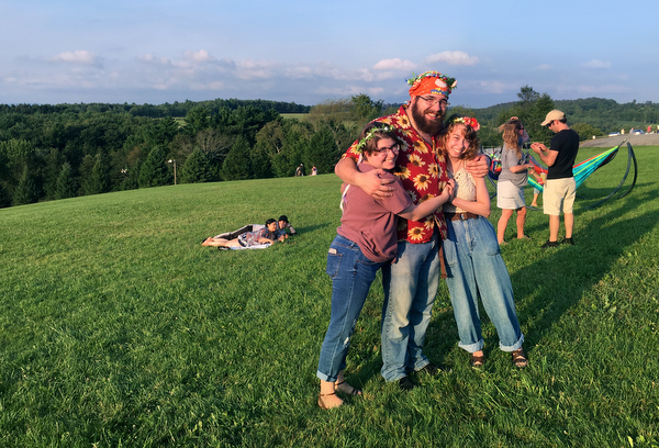 My black and green folding bike, Jetson, had been plastered with colorful reflective bits by my caring wife, Lorie. Friday evening I rode Jetson out of Yasgur’s Farm. Cresting a hill, lines of backed-up cars came in view, funneled into the turn to Bethel Woods, and I was very glad the area roads included bike lanes. State and local police directed traffic and politely assisted in my road crossing. The bike was a good choice! Riding uphill passing an infinity of parked cars, it felt like I was getting away with something, breezing by on a bicycle. Then, at the pedestrian entrance, all became lemmings inching through security checkpoints to get into Wonderland. While securing my bike to a lamp post, a couple of really nice volunteers came over to say hello and give me some wonderful insight into Bethel Woods. Soon after, I met up with close friends from the High Country, Valerie, Ed, and Max Midgett of Boone’s beloved Neighborhood Yoga who had just seen David Crosby and had a great time in the Big Apple. Not sure if any other High Country residents made it for the celebrations, but we had representation there and sharing the scene with this euphoric Boone family made the experience all the better.
