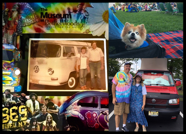 Wandering down from the cheap seats on the lawn, you could walk the outer rim of the amphitheater for a closer look. Getting different perspectives, meandering the paths and lawn during the concert, I noticed one tie-dyed couple sitting under a tree with a golden fuzzy Pomeranian named Snorri. We met and they explained Snorri was blind. They were Pat and Jim from New Jersey and mentioned being in a photo at the Woodstock museum with their VW bus. I ended up spending much of my time with this warm trio for two of the three evenings at Bethel Woods and I feel we’ve become friends for life.