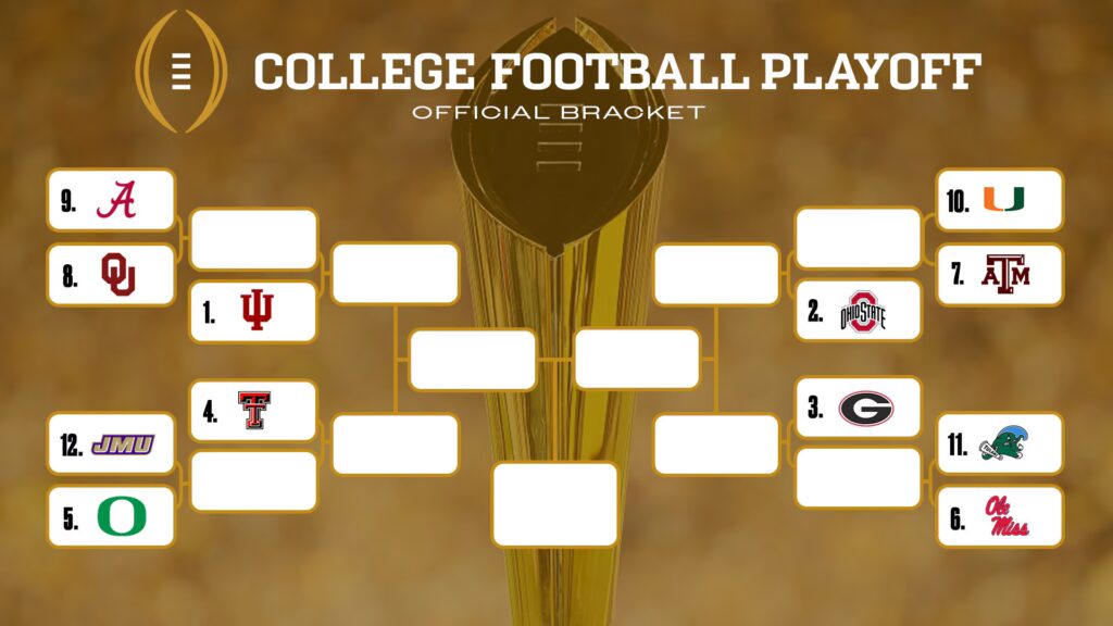 The 2025-26 College Football Playoff (CFP) starts with First Round games on December 19-20, 2025, at the campus site of the higher rated team. This will feature No. 9 Alabama at No. 8 Oklahoma (Dec 19) and No. 10 Miami at No. 7 Texas A&M, No. 11 Tulane at No. 6 Ole Miss, and No. 5 Oregon vs. No. 12 James Madison (Dec 20). The tournament progresses through Quarterfinals (Dec 31-Jan 1), Semifinals (Jan 8-9), and culminates in the National Championship on Monday, January 19, 2026, in Miami Gardens, Florida.