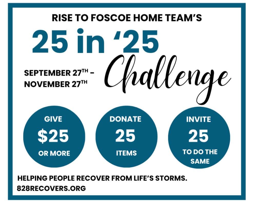 The month began with an event at Linville Falls Winery to celebrate the High Country’s resilience on September 27, the one year anniversary of Hurricane Helene. The Wiseman family generously provided the vineyard for the event. The night was filled with music by The Shelby Rae Moore Band, a silent auction, whiskey pull, amazing wine, raffle, matching grant, stories of resilience, a message from Trice and the launch of the 25 in 2025 campaign. With the matching grant, the evening raised awareness, compassion and over $30,000 for Foscoe Home Team.