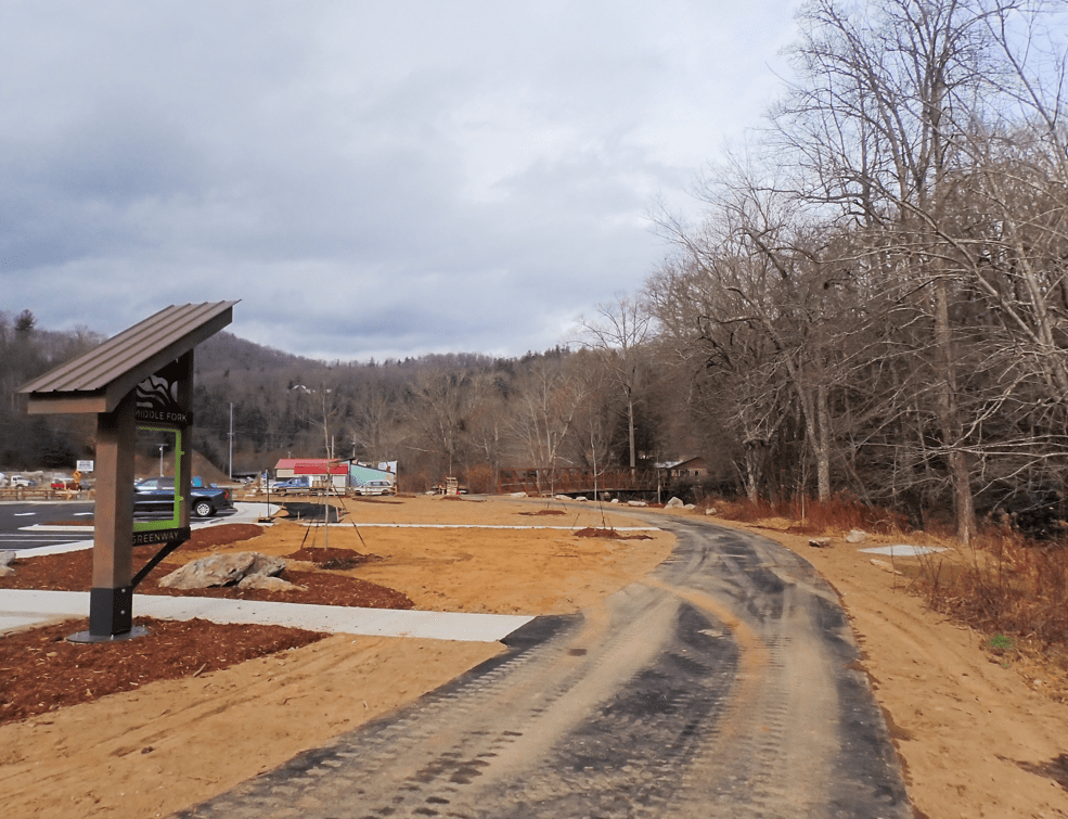 The 321 Trailhead (Section 4, Phase 1) on the Middle Fork Greenway will be opening soon and two more phases of this section are in progress. The trailhead includes 27 parking spaces, benches, a picnic area, bike racks, two bridges, river access, and a large rain garden to capture stormwater runoff. This section has two additional phases to be constructed before connecting to the existing mile-long section at Tweetsie Railroad and Mystery Hill.